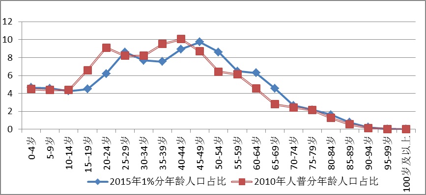 圖1 ?2015的1%與2010“六普”分年齡占比