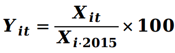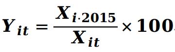 第一步:使用以2015年基期數值為100的方法,對三級指標進行標準化處理,得到個體指數。具體處理方法如下:
