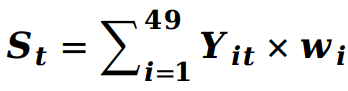 其中,Yit為第i個三級指標第t年個體指數,wi為第i個三級指標權重,St為第t年總指數。