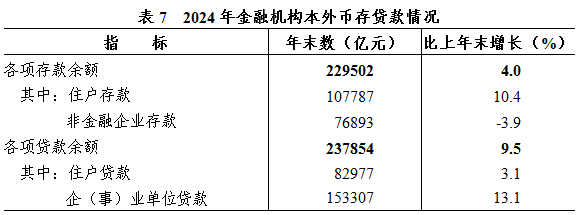 年末全部金融機構本外幣各項存款余額229502億元,比上年末增長4.0%,其中人民幣存款余額增長4.0%。住戶本外幣存款余額107787億元,增長10.4%。全部金融機構本外幣各項貸款余額237854億元,增長9.5%,其中人民幣貸款余額增長9.7%。年末主要農村金融機構(農村信用社、農村合作銀行、農村商業銀行)人民幣貸款余額37815億元,比年初增加3768億元。