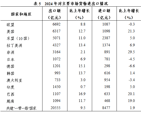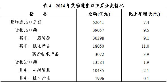 全年貨物進出口52641億元,比上年增長7.4%,其中出口和進口分別為39057和13584億元,分別增長9.5%和1.9%;規模分別居全國第三、第二和第五位,占全國份額分別為12.0%、15.3%和7.4%,進出口、出口占全國份額均比上年提高0.3個百分點。有進出口貿易的國別(地區)達252個;對中東、非洲、東盟、拉美進出口分別增長3.2%、7.1%、9.0%和11.8%,合計拉動全省進出口增長3.4個百分點;對共建“一帶一路”國家進出口增長7.2%;對歐盟、美國進出口分別增長7.4%和13.9%。出口商品結構轉型升級,機電產品出口增長11.0%,占全省出口的46.2%。