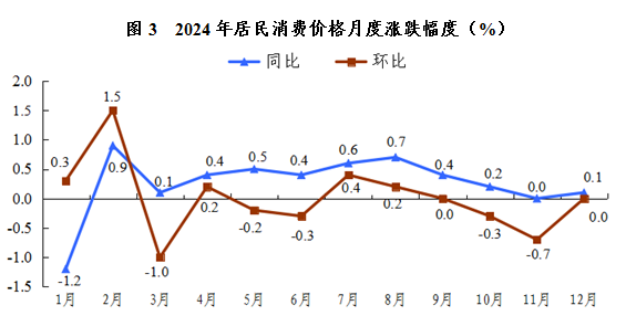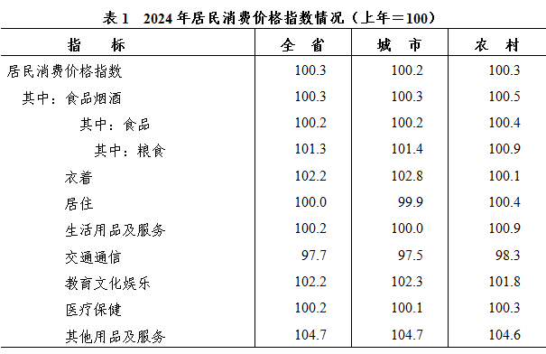 全年居民消費價格比上年上漲0.3%。其中,城市上漲0.2%,農村上漲0.3%;消費品價格持平,服務價格上漲0.6%。工業生產者出廠價格下降2.2%,工業生產者購進價格下降2.4%。