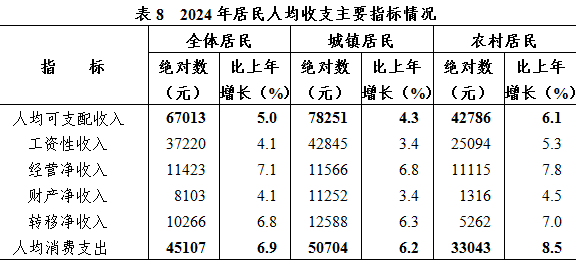 全年居民人均消費支出45107元,比上年增長6.9%,扣除價格因素實際增長6.6%。按常住地分,城鎮居民人均消費支出50704元,增長6.2%,農村居民人均消費支出33043元,增長8.5%,扣除價格因素實際分別增長5.9%和8.2%。