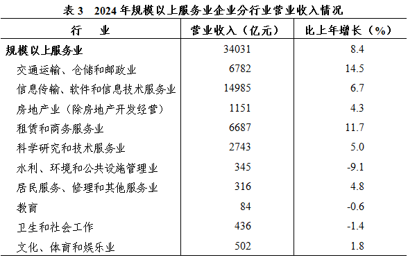 [6]規模以上服務業統計范圍包括:年營業收入2000萬元及以上的交通運輸、倉儲和郵政業,信息傳輸、軟件和信息技術服務業,水利、環境和公共設施管理業,衛生行業法人單位;年營業收入1000萬元及以上的房地產業(不含房地產開發經營),租賃和商務服務業,科學研究和技術服務業,教育行業法人單位;以及年營業收入500萬元及以上的居民服務、修理和其他服務業,文化、體育和娛樂業,社會工作行業法人單位。