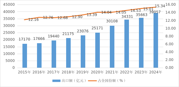 五年來,浙江積極打造內外貿有效貫通的市場樞紐,努力建設輻射全國、影響全球的貿易強省。社會消費品零售總額由2020年的2.8萬億元增至2024年的3.8萬億元,穩居全國第四;網上零售額穩居全國第二。進出口總額由3.4萬億元增至5.3萬億元,年均增長11.7%,其中出口由2.5萬億元增至3.9萬億元,年均增長11.6%,高于全國、江蘇、廣東。2021年進出口規模首次超過上海居全國第三,2023年出口首次超江蘇居全國第二,出口占全國的份額由2020年的14.0%提升至2024年的15.3%,浙江提升幅度在全國前五大出口省(市、區)中最大。
