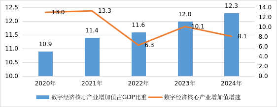 圖2 2020-2024年浙江數字經濟核心產業增速及占GDP比重(%)